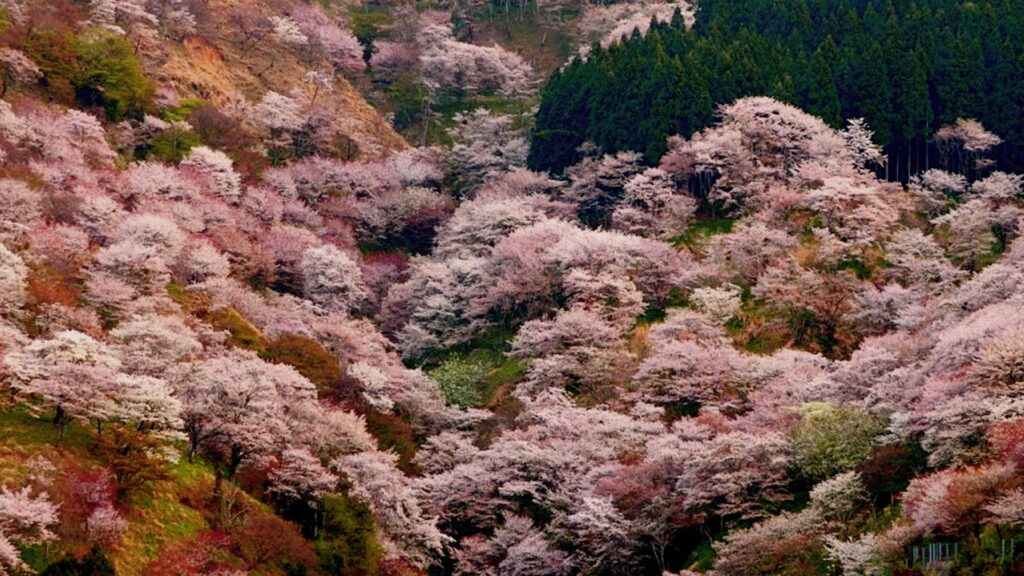 Since ancient times, it has been called “Hitome Senbon” (a thousand trees at a single glance) and is known as the best cherry blossom mountain in Japan. Approximately 30,000 Shiro-yamazakura trees bloom in order from the foot to the summit, dyeing the entire mountain in a pale pink gradation. The scenery woven by the cherry blossoms and the sacred atmosphere as a holy site for Shugendo is truly a soul-stirring beauty.