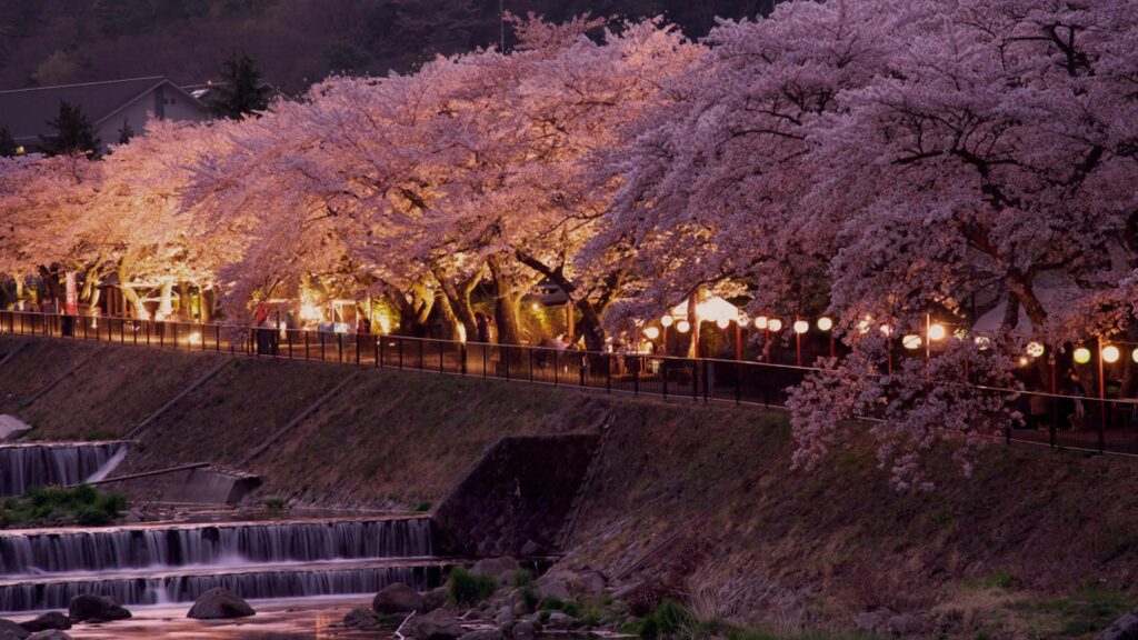 Along the Hayakawa River in Miyagino, Hakone, about 150 Yoshino cherry trees bloom in glory over approximately 600 meters. The moment of walking through the cherry blossom arch while listening to the murmur of the river is filled with a sense of liberation that makes you forget daily life. Light-ups are held at night, and the magical night cherry blossoms reflected on the river surface are the highlight of spring in Hakone. Because the altitude is higher than the city center, the charm is also that you can enjoy cherry blossom viewing for a longer period.