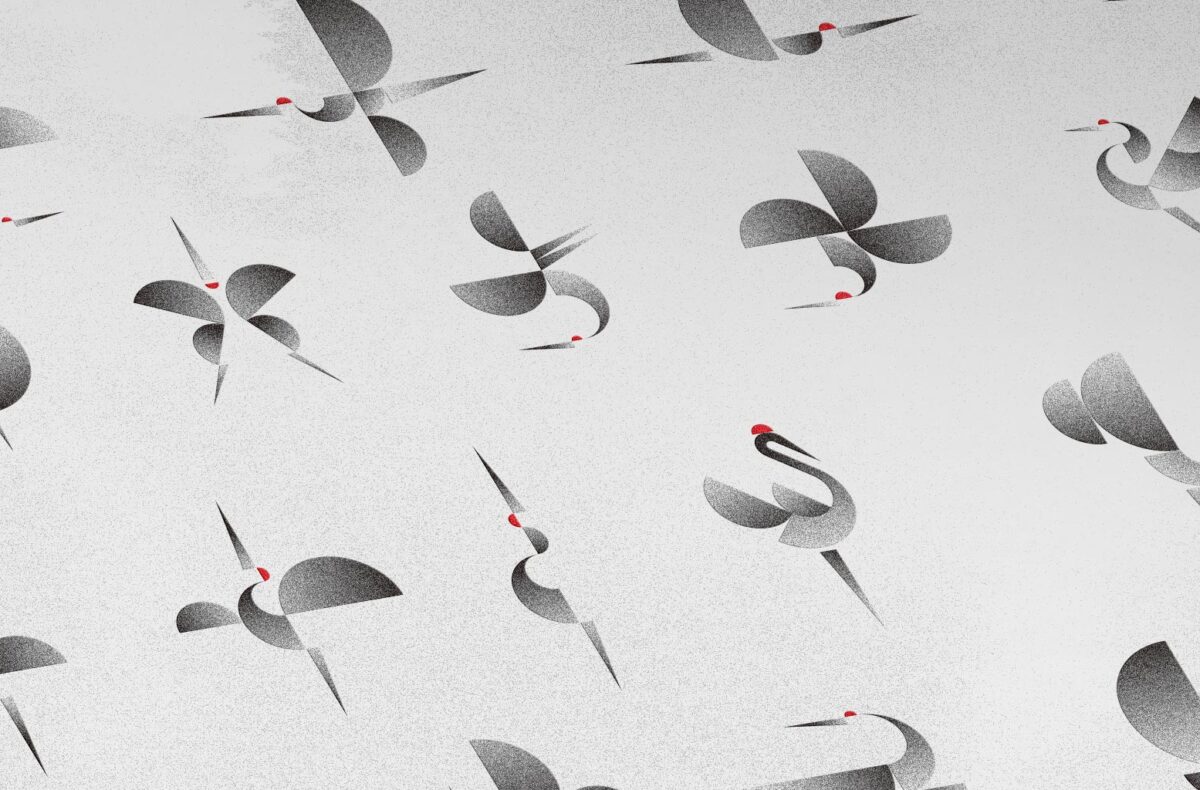 鶴は日本を代表する鳥の一つで、特に丹頂(タンチョウ)として知られます。学名はGrus japonensisで、英名にも「Japanese Crane」と日本の名が入るほど。主に北海道の湿原に生息し、冬には雪原で優雅に舞う姿が印象的です。絶滅危惧種として保護され、アーティストTakkakeiはその丹頂を幾何的な構成で、凛とした上品さと生命の躍動を表現しています。